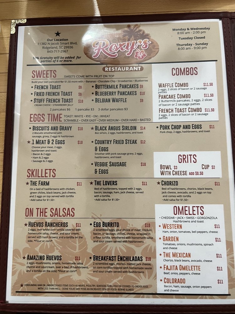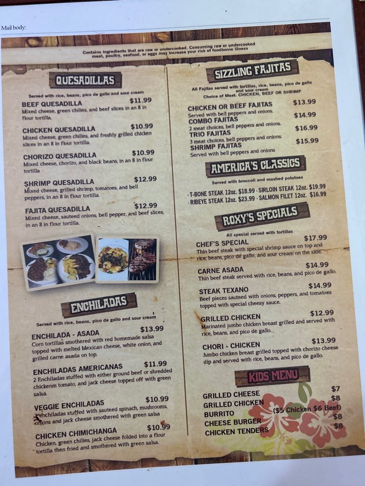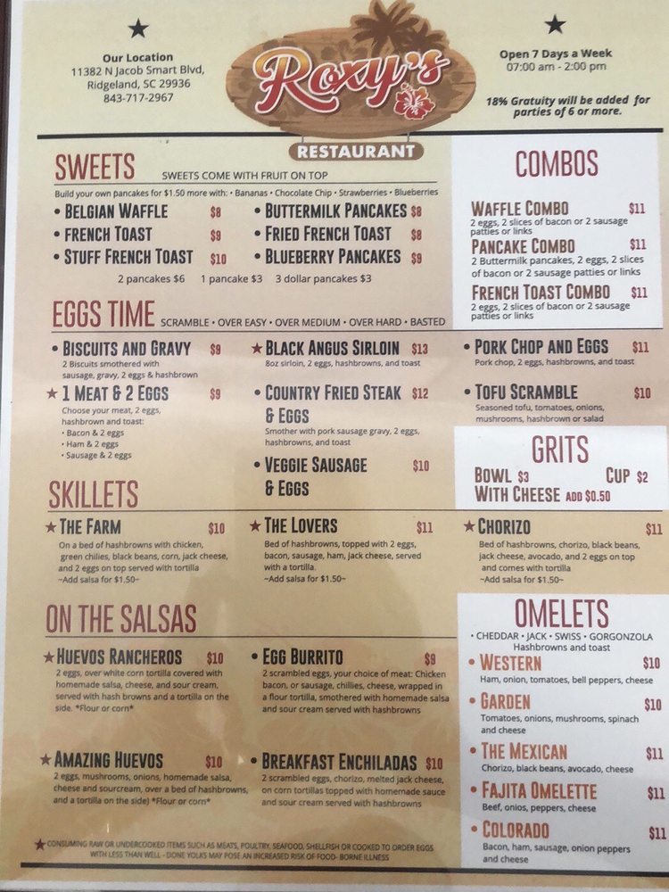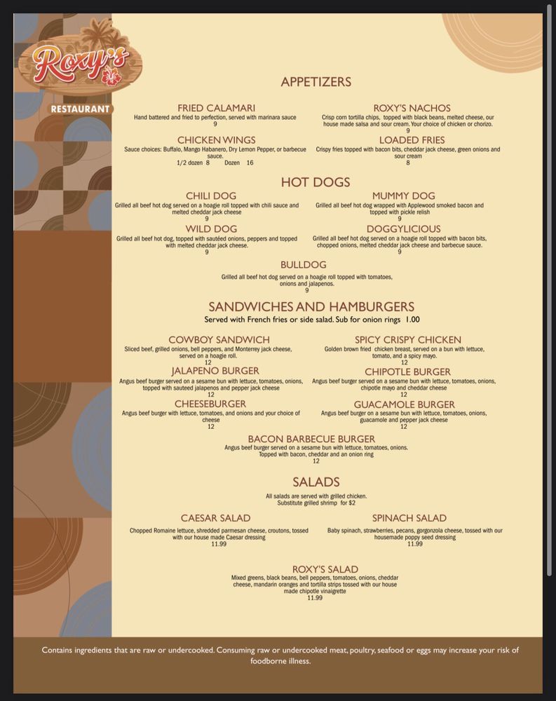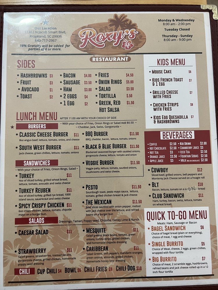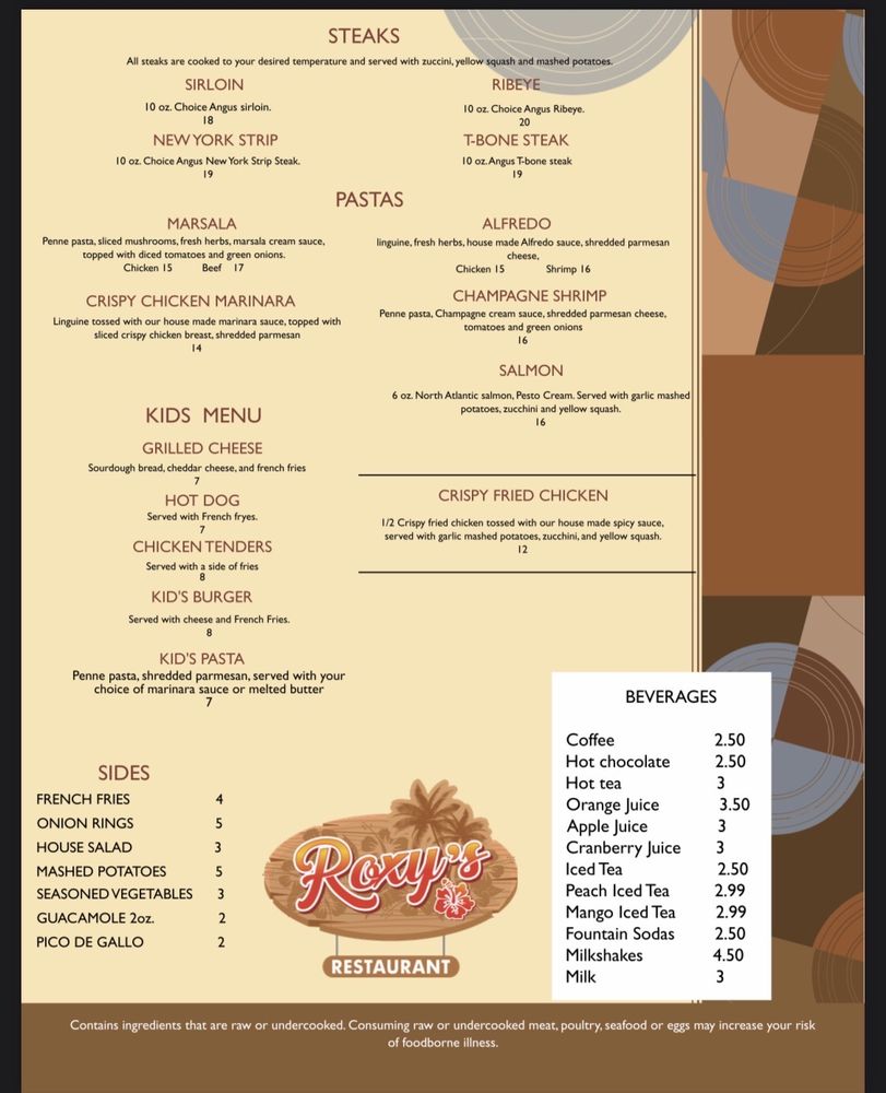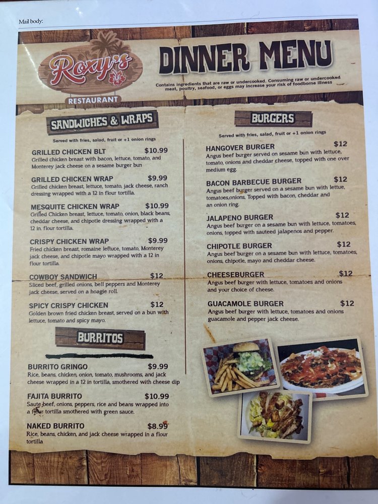 Roxys Restaurant Menu